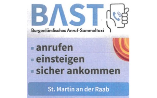 Das burgenländische Anruf-Sammeltaxi „BAST“ verstärkt die Erreichbarkeit der teilnehmenden Gemeinden und schließt die Lücken im öffentlichen Verkehrsnetz. Bedient werden die Fahrgäste auf Abruf: Nach der telefonischen Buchung (0800 500 805) oder App Buchung kommt das BAST zur gebuchten Abfahrtszeit zum angegebenen Haltepunkt.