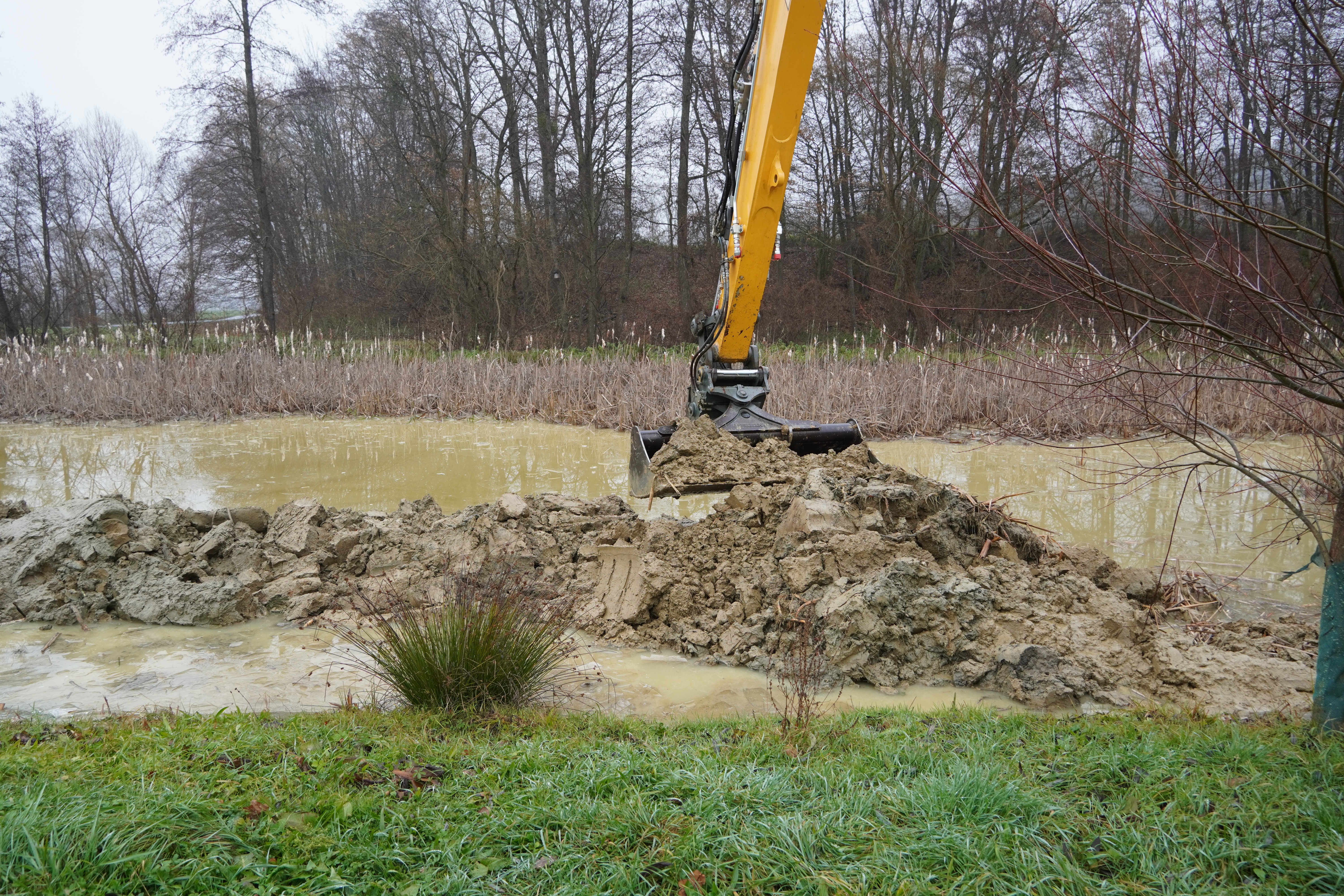 Einen weiteren zentralen Projektbaustein stellte das schonende Ausbaggern ausgewählter Feuchtbiotope dar. Diese Maßnahme wurde mit großer Sorgfalt durchgeführt und zeigt eindrucksvoll, welch positiven Beitrag auch größere technische Eingriffe zum Naturschutz leisten können, wenn sie fachgerecht umgesetzt werden. Die betroffenen Biotope waren durch zunehmende Verlandung infolge dichter Vegetation sowie durch Sedimenteinträge und Abschwemmungen von benachbarten Ackerflächen akut gefährdet. Durch das Ausbaggern konnten offene Wasserflächen wiederhergestellt und die langfristige ökologische Qualität der Feuchtlebensräume gesichert werden.